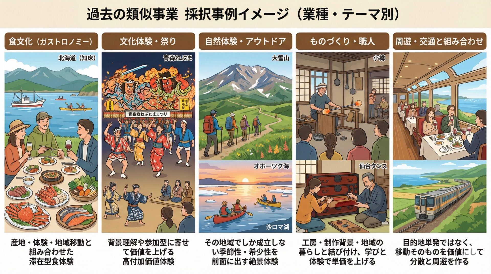 | 文化体験・祭り | 「ディープな青森ねぶたのフル体験…」/「帯広アイヌ古式舞踊…高付加価値…」 | 見学だけでなく、背景理解や参加型に寄せて価値を上げる |