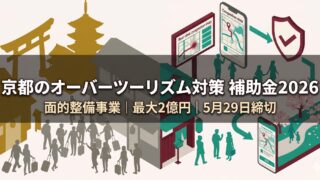 京都のオーバーツーリズム対策に活用できる補助金を2026年の公募要領に基づき解説。観光庁の面的整備促進事業(補助上限2億円、5月29日締切)、京都府の朝・夜観光推進事業(上限300万円)、京都市の具体的取組事例まで。行政書士が監修。