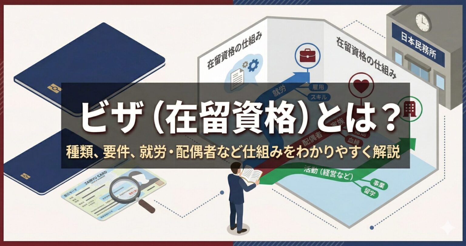厳密には「ビザ(査証)」は入国前に在外公館で発給される入国推薦の書類で、「在留資格」は入国後に付与される滞在許可です。ただし日常会話では両者を区別せず、「就労ビザ」「配偶者ビザ」のように在留資格のことをビザと呼ぶことが一般的です。本記事でもこの慣例に沿って解説します。